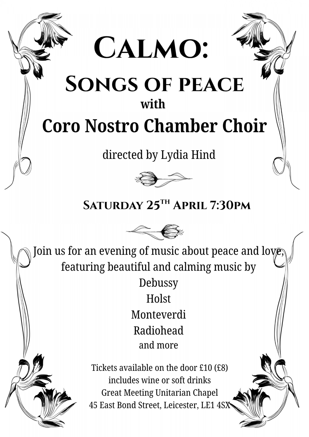 Is the world feeling a bit too much at the moment? If so why not join Coro for a evening of music about peace and love, featuring beautiful and calming music by Debussy, Holst, Monteverdi, Radiohead and more… We’ll give you a glass of wine too! 🙂