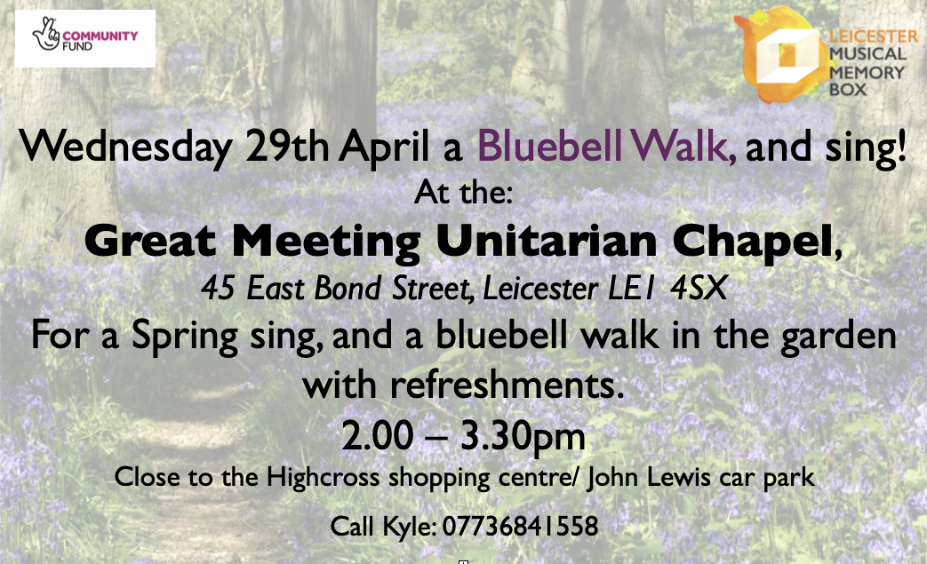 Join us for our annual dementia friendly Spring Singalong with a Bluebell Walk with Leicester Musical Memory Box!This event, although geared up specifically towards people living with dementia and memory loss, is open to absolutely anyone!